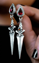 These earrings feature a sharp athame or dagger, with glowing red gems affixed to the front. A small way to bring some subtle deathly glamour to any look.