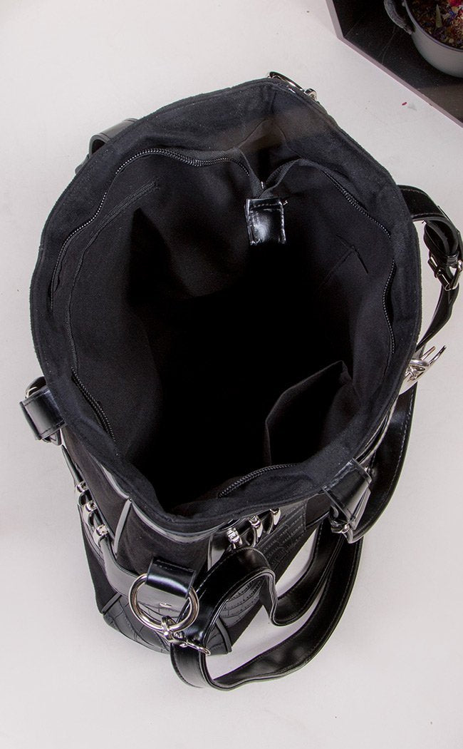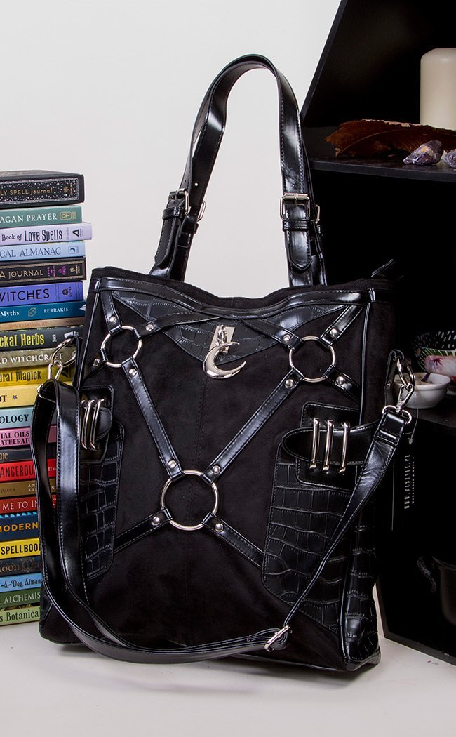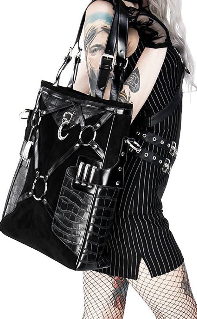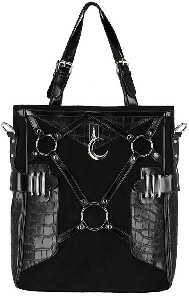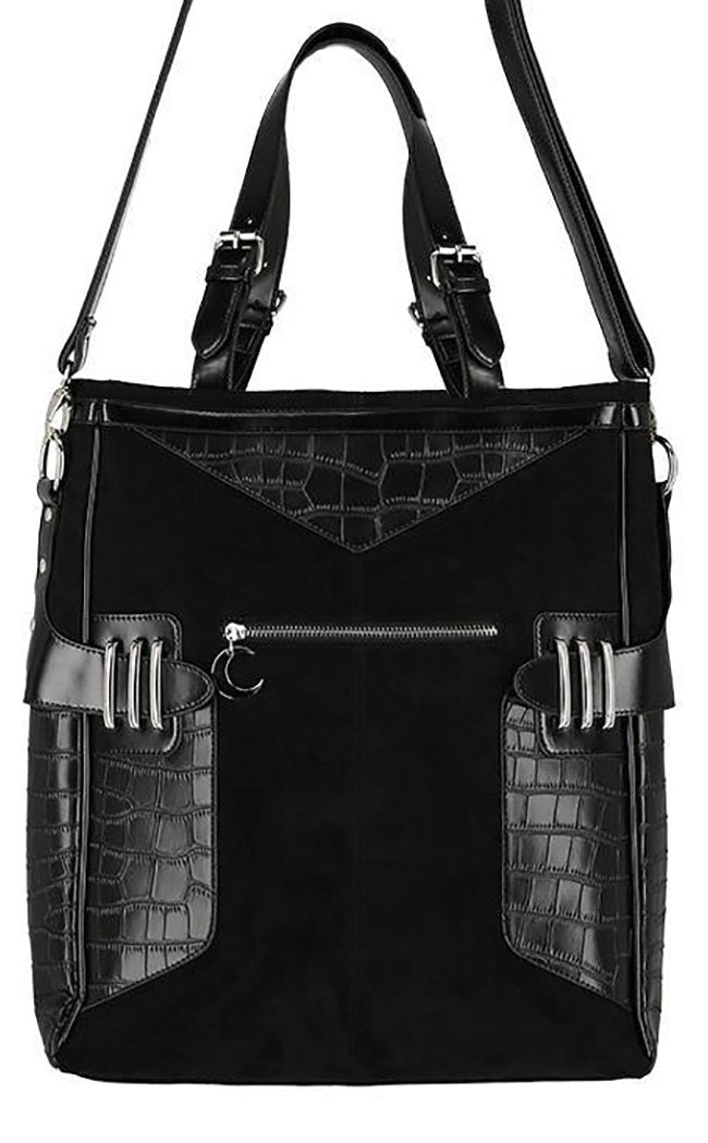 Unload your burdens into this giant tote. The front features an O-ring harness in faux leather alongside faux crocodile skin decals on a soft, velvet body. Go from a tote with the attached straps to a shoulder bag in no time with a removable shoulder strap, both adjustable. The inside of the bag has enough space for gym supplies and can even fit groceries from a quick shopping trip, plus you can keep your phone and keys close with a pocket on the rear.