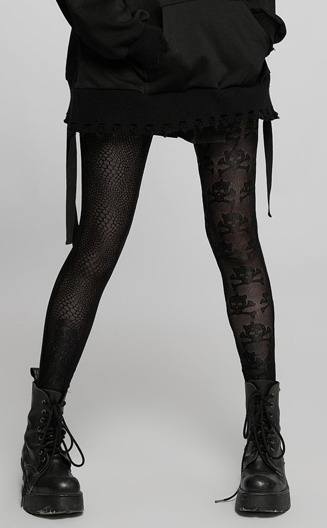 The emos rise again! The Little Crush Mesh Leggings are a super cute and versatile styling piece, made with soft stretch mesh featuring a skull print on one leg and an uneven fishnet pattern on the other.