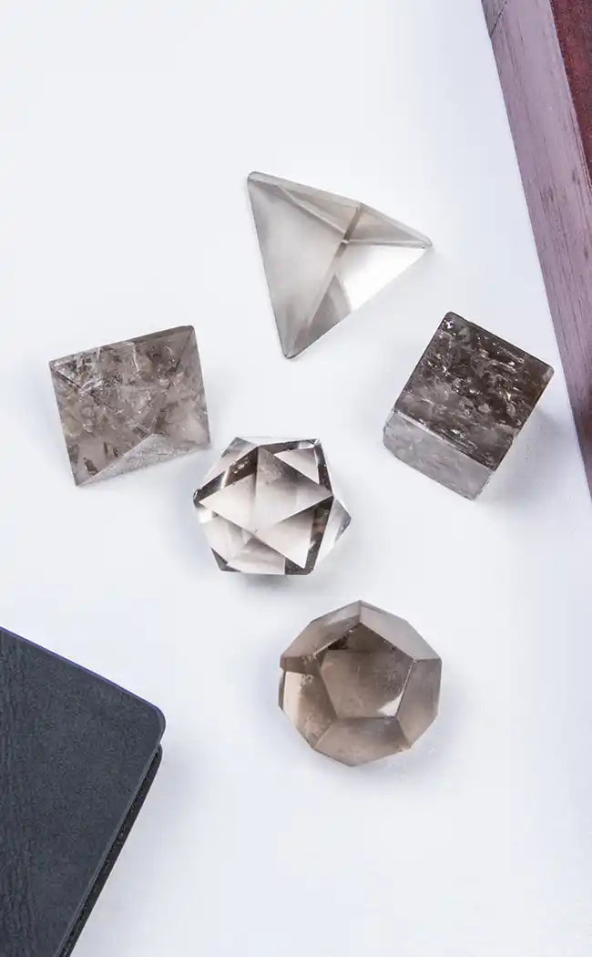 This set of 5 crystals are carved into prisms relating to the elements water, earth, the universe and air as well as the star tetrahedron.
