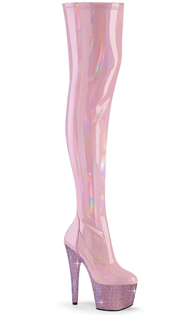 Time for a little glitter and shine! The luxurious BEJEWELLED-3000-7 thigh-high boots feature a heel and platform totally encrusted with pink rhinestones, topped with pink holo stretch faux leather. The boots secure with a half-length inner zip for easy on/off.