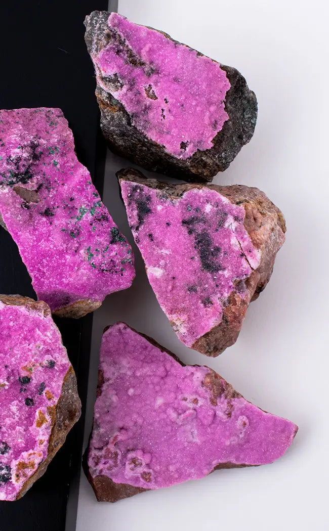 You will receive a single specimen. These all have lots of sparkly glitter Druze covering them and there are two colours - rosy pink, or a lighter, almost lilac pink. They weigh between 50-120gm and some have inclusions of malachite and other copper-based minerals.