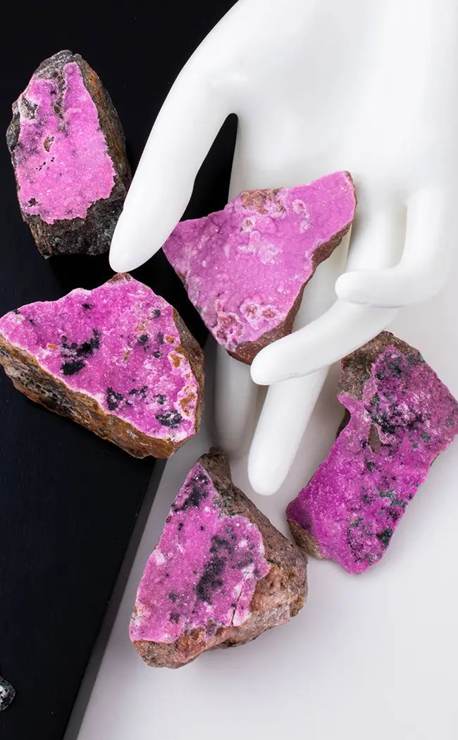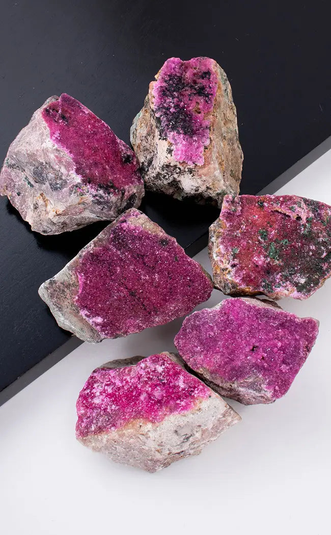 Salrose is the common name for Cobaltion Dolomite, sometimes referred to as Pink Calcite or Cobalt Calcite. It is exceedingly rare to get such gorgeous gemmy crystalline specimens as these. These are a deep rosy pink hue, with gemmy crystals.