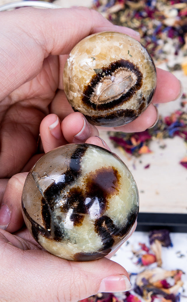 These are beautifully cut and polished Septarian Spheres from Madagascar. A sphere is a round ball-shaped crystal shaped from a much larger piece of crystal. This shape emits energy equally in all directions.