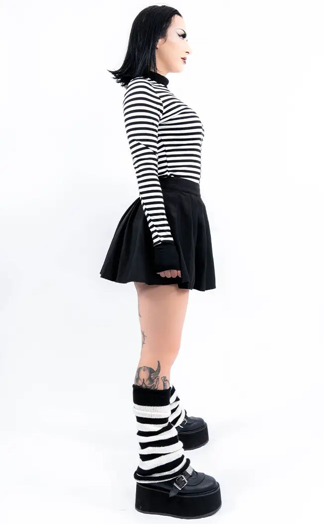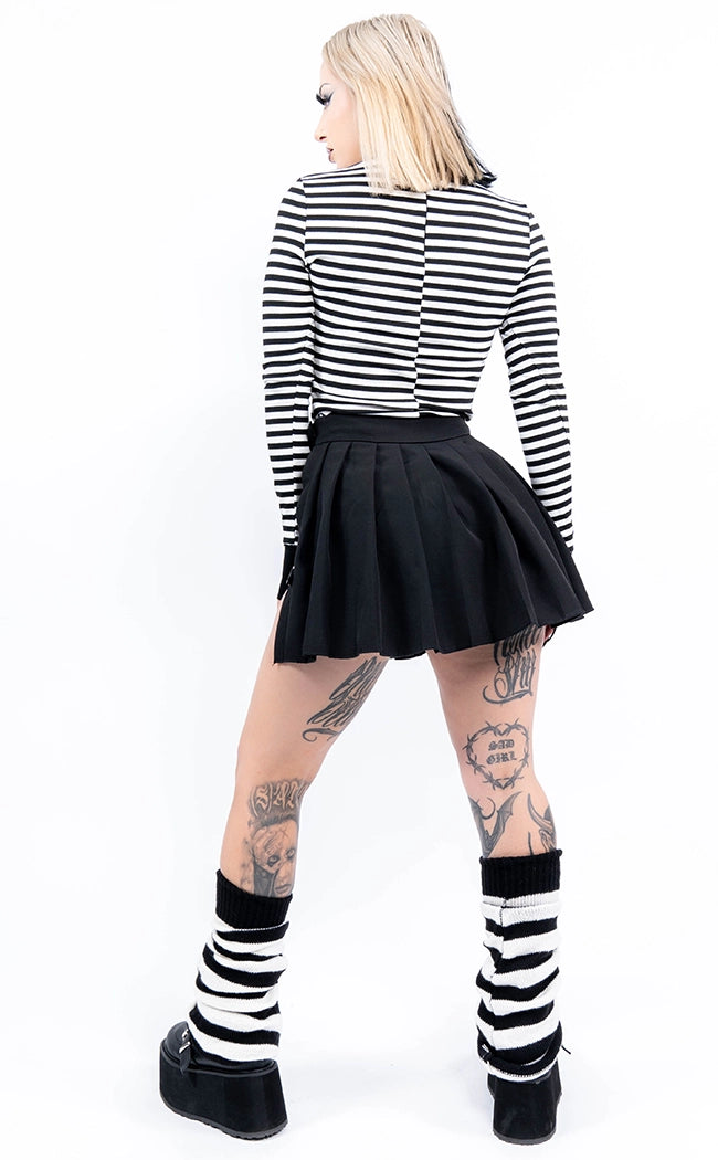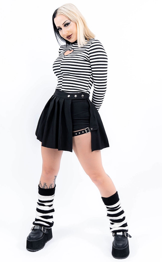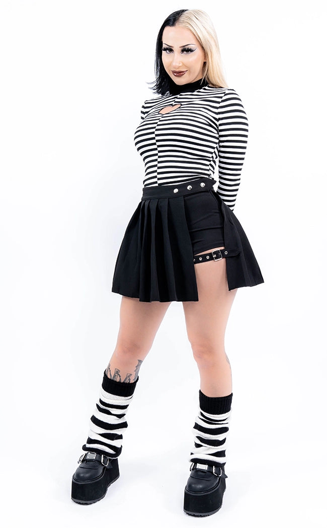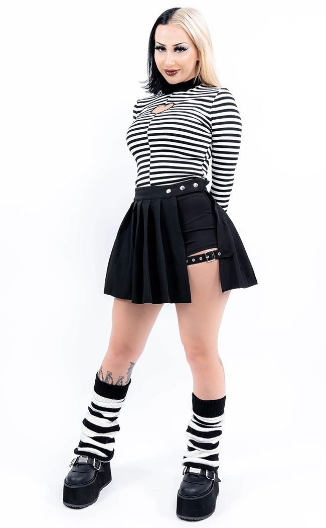 - This skirt splits on the left to reveal under-shorts and buckle features.