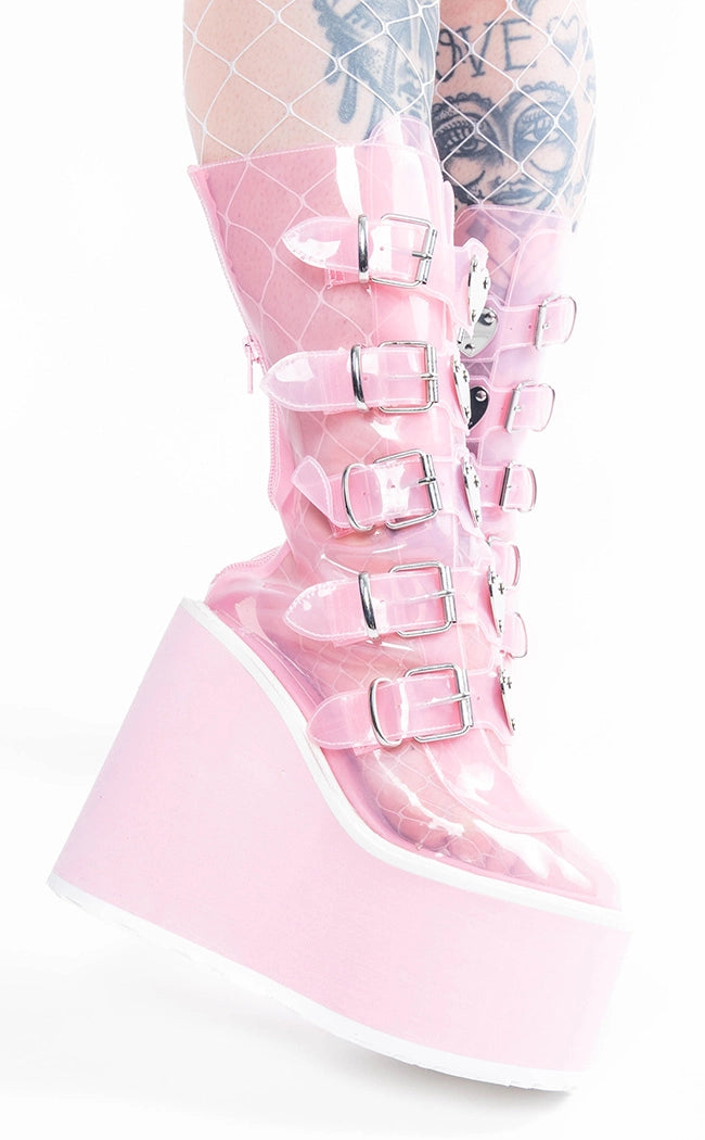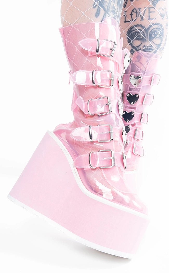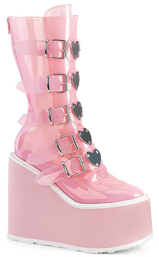 A pretty pair for the babes who wear their hearts on their sleeves! The SWING-230C translucent mid-calf boots are tinted an adorable baby pink and feature 5 heart plated-straps on top of a matching wedge platform. The boots secure with a rear zip for easy on/off.