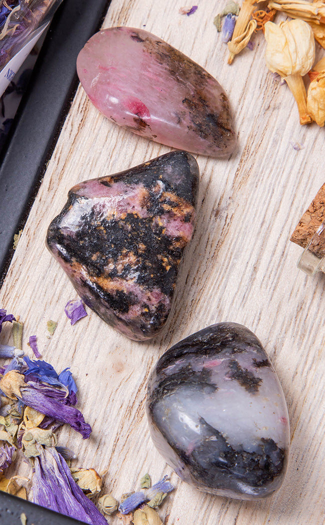 Rhodonite is a beautiful stone with rich pinks and reds intercut with veins of black or grey. It's an emotional healer, keeping you in balance as it stimulates and heals your heart. It's a compassionate companion and encourages forgiveness, allowing your soul to let go of past struggles.