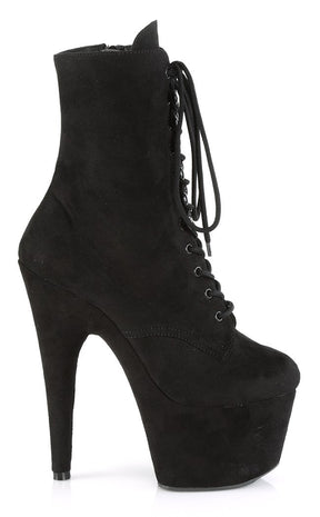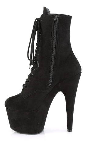 7" (178mm) heel, 2 3/4" (70mm) platform lace-up front ankle boot featuring fully wrapped platform bottom, inside zip closure