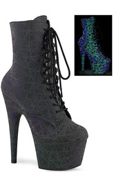 A bootie that reveals green & purple reflective webbing when placed under a black light. With a lace up front and inner zip for easy on/off, these booties are ideal for cyber dancers and futuristic pole fitness fanatics.