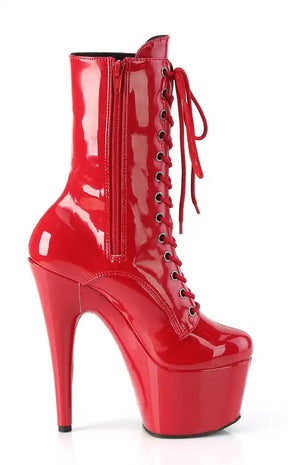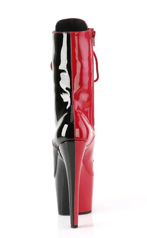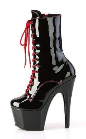 7" (178mm) heel, 2 3/4" (70mm) platform two tone lace-up front ankle boot featuring fully wrapped platform bottom and inner side zip closure.