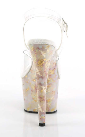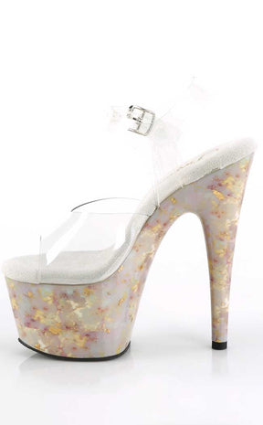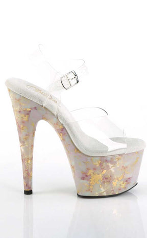 You're a work of art carved in marble! The ADORE-708MB heels feature a clear upper and a marble print wrapped platform a heel, decked out in blush and gold patterning. The heels secure with an ankle strap.