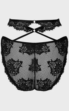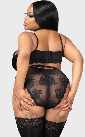 Turn into a demon dominatrix in the Killstar Affinity Bondage Panty. Conjured using a luxe stretch lace with velvet panels which stretches to perfection for a seductive and comfortable fit. Complete with accent straps this piece will make them beg.