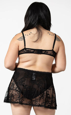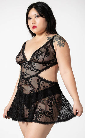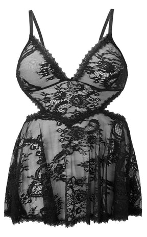 Resurrect your slumber threads with the Afterlife Lace Nightdress! The softest lace conjured from pure darkness slinks around your beautiful body, forming cutouts at the waist, adjustable shoulder straps and a hook and eye closure at the back.