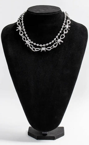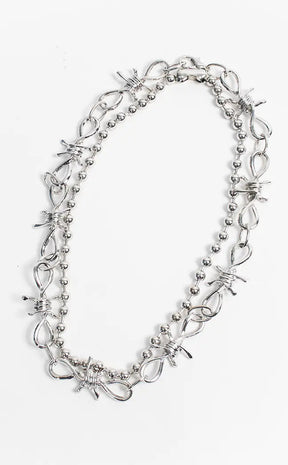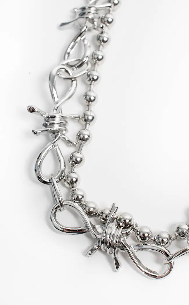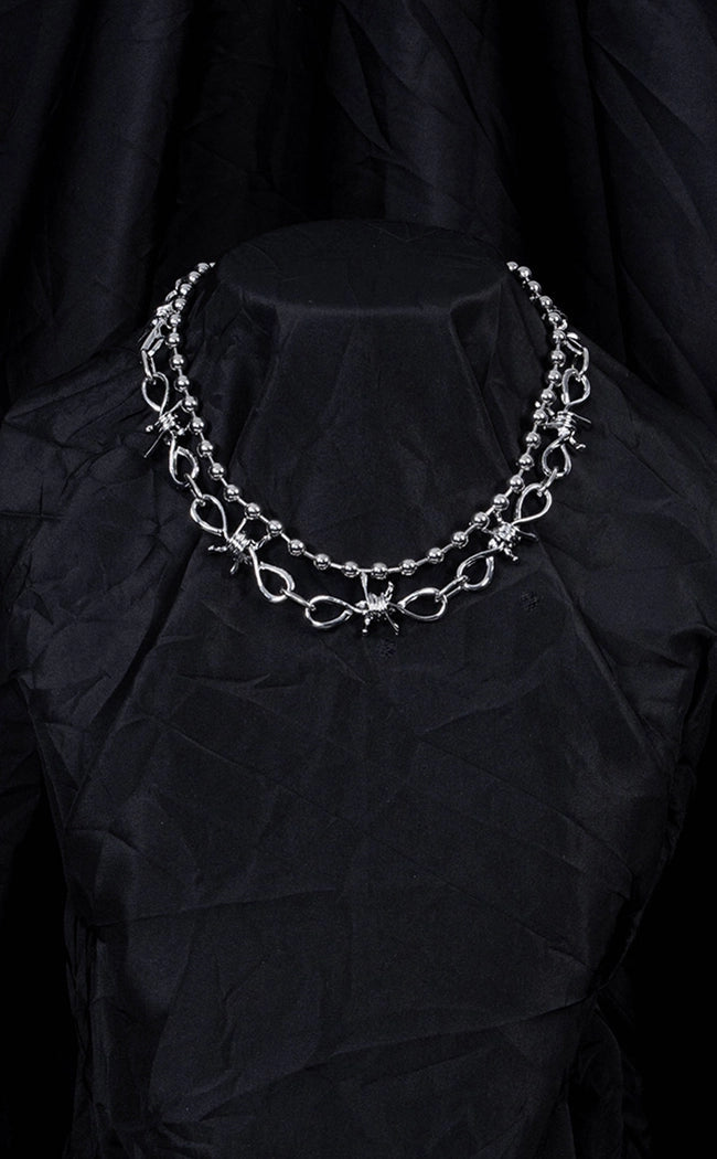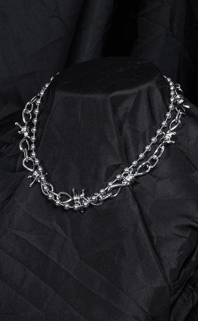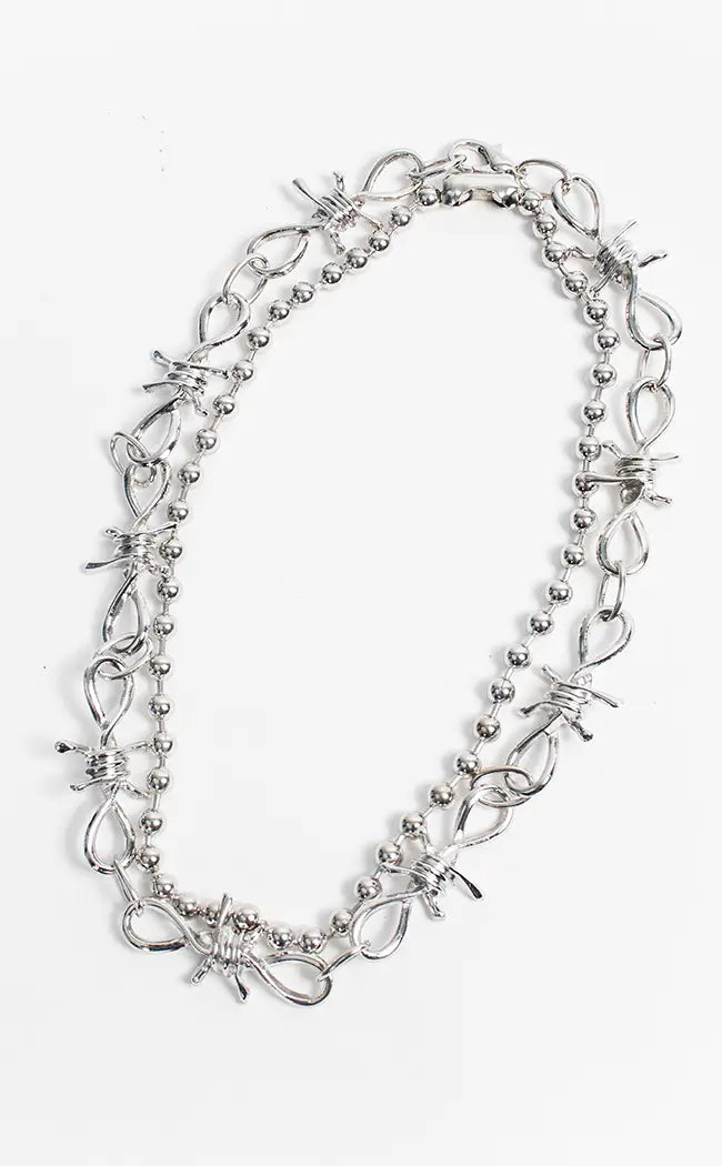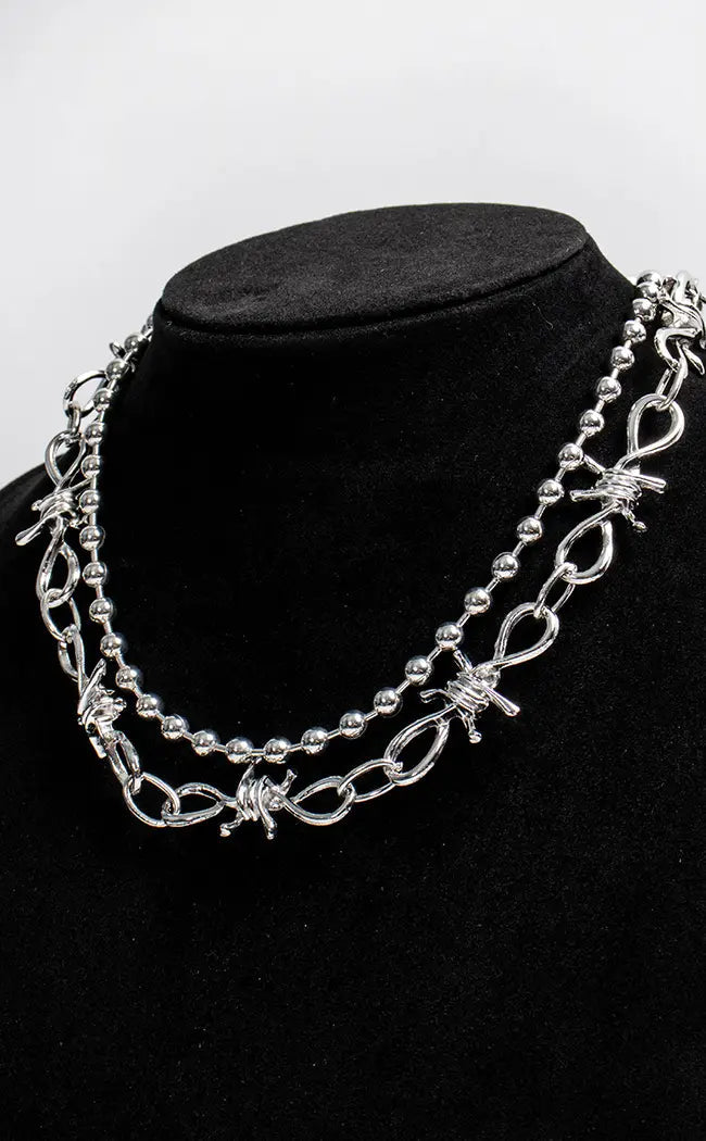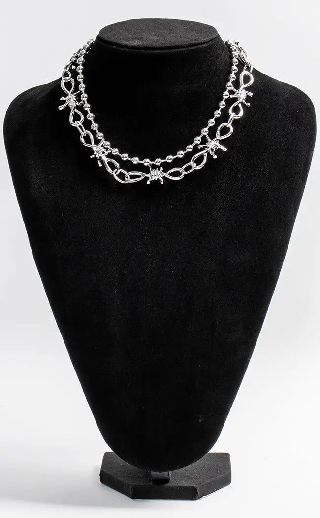 You'll look ravishingly sinful in our Already Disturbed Necklace Set! Featuring two necklaces - one with round silver beads and the other featuring barbed wire. Unleash your inner disturbance with this set.