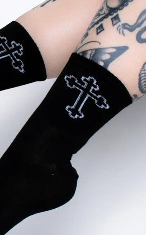 Add a touch of heavenly hosiery to your 'fit with these black cross socks. sitting just above the ankle, the cross detailing on these crew socks add a subtle hint of gothic style to your fit, perfect for corp goths and those who love the dark acadamia aesthetic.