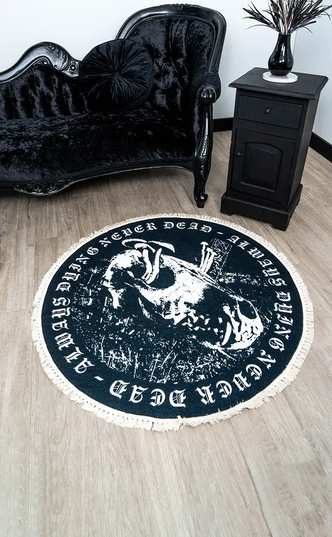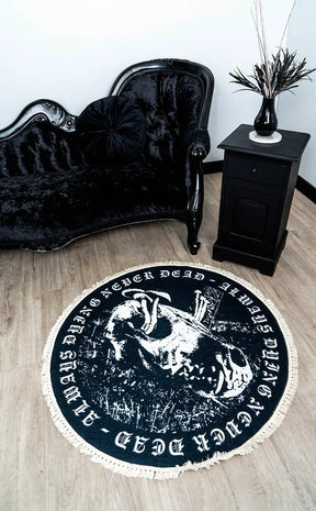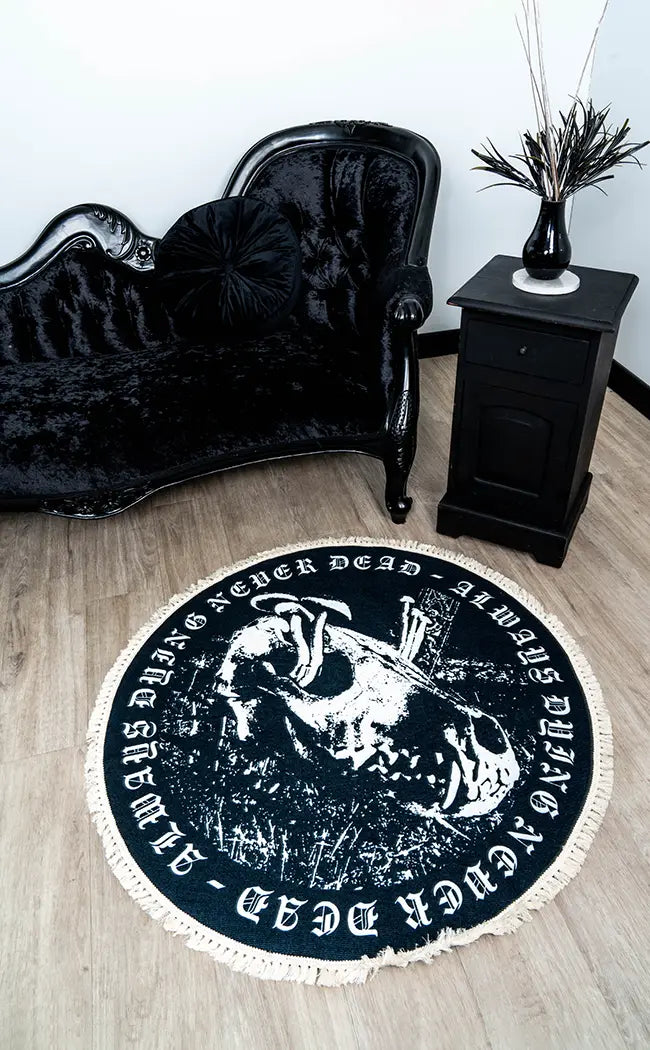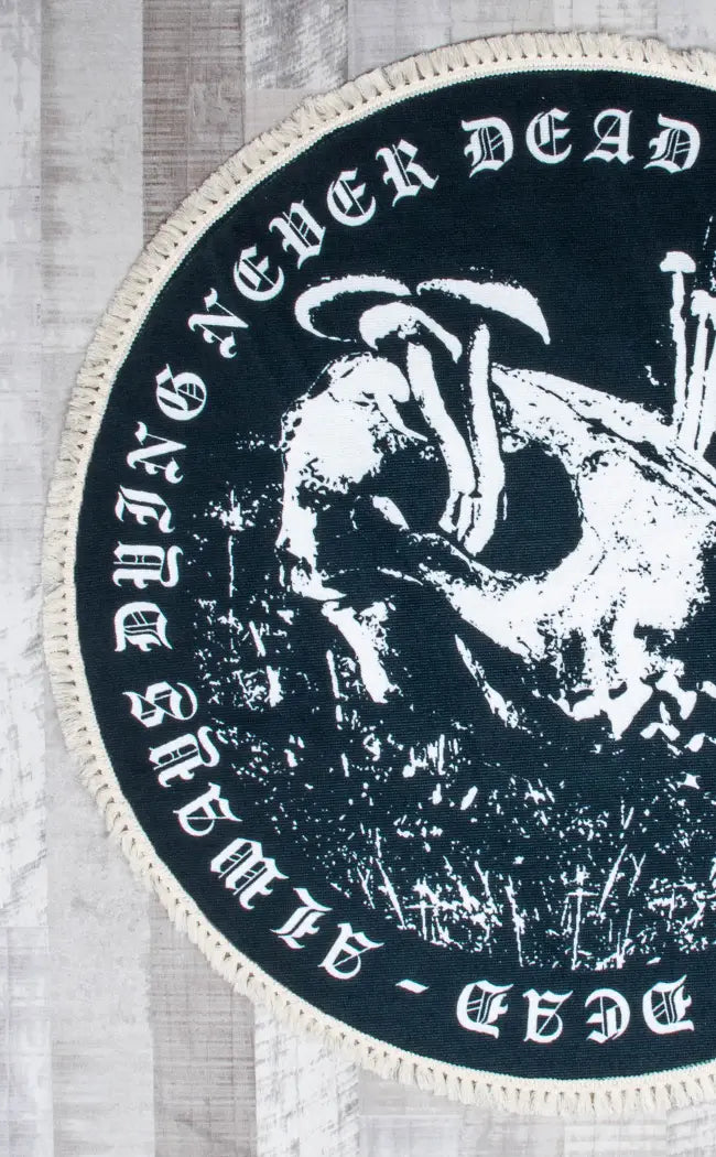 This striking floor-covering features an ornate design with very goth elements in white such as a skull and border saying "Always Dying, Never Dead". This round rug is trimmed with a fringe, perfect for rolling out in bedrooms and loungerooms to create a relaxing, magickal atmosphere.
