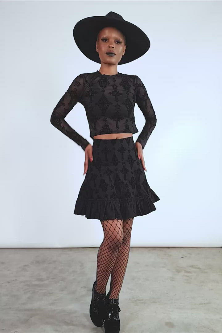Haunt their nightmares in the Amelie Flocked Mini Skirt! This mini skirt features an elegant flocked pattern, oozing Victorian vibes and making a wicked statement. The hem is ruffled to flow with you as you stomp the streets, perfect for pairing with stockings and chunky Mary Janes.
