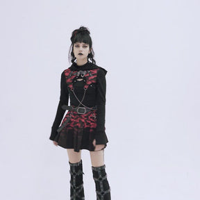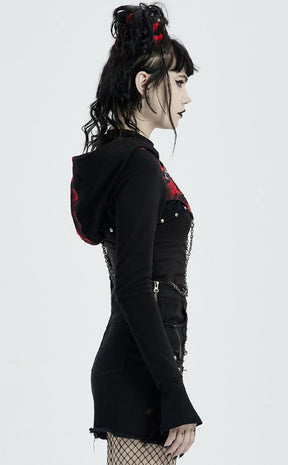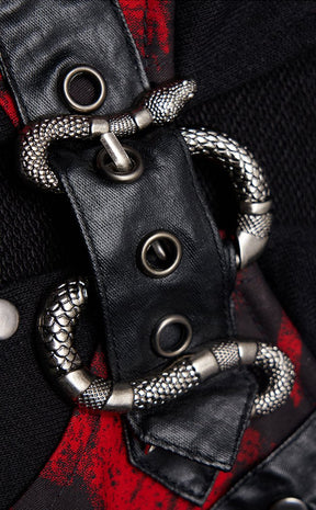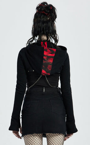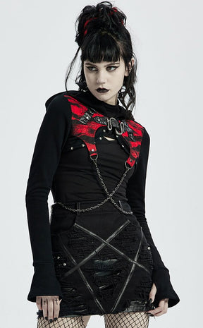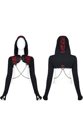 Kit up like a rebel warrior! This bolero style hood features two removable criss crossing chains that sit flatteringly over your midsection. The hood can be worn up or now depending on how much mystique you wanna exude. The front is done up with an xxxtra snake buckle to go with the rest of the heavy metal in yer outfit.