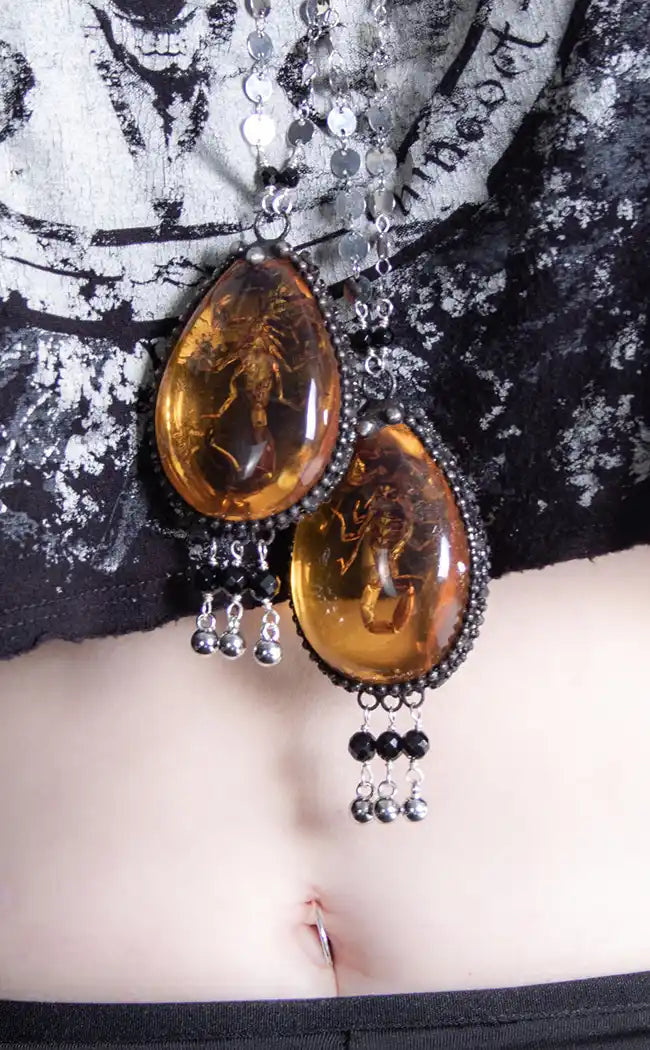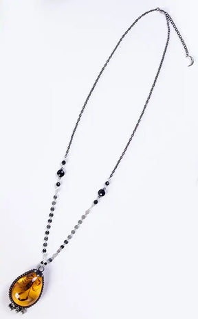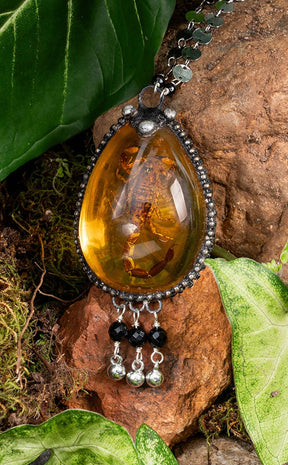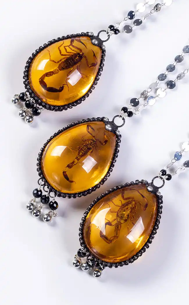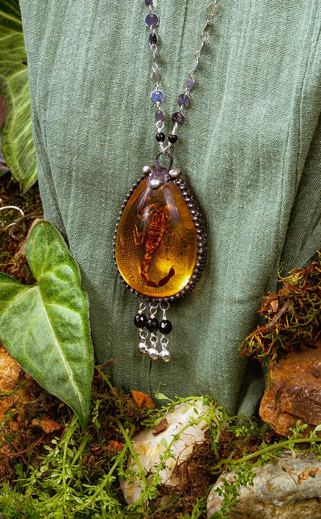 The Anathema Necklace is an incredibly beautiful and unique piece. Each one is made from a very large vintage pendant of orange resin, with a preserved scorpion inside.