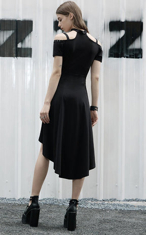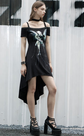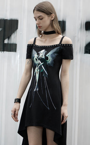The collar of this dress is adjustable so it can sit comfortably above the cold shoulder trimmed in badass rivets. Two shoulder straps keep everything secure (and totally hide that bra!) The front is printed with artwork of a beautiful angel who may not be as chaste as she appears.