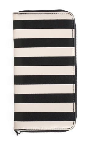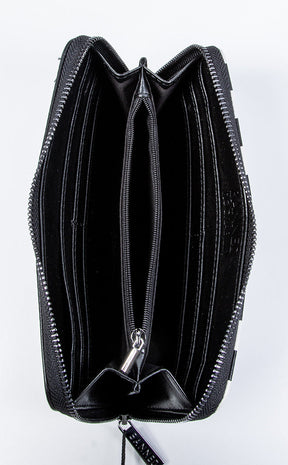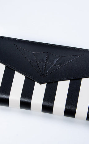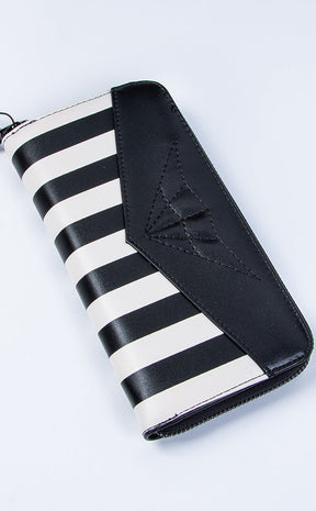 Spooky stripes and all things nice! The Another Lost Soul Wallet features a faux leather outer decked out with black and white stripes and an embroidered black spiderweb. The wallet secures with a zip, opening to reveal a zipped coin pocket, note compartments and plenty of card slots.