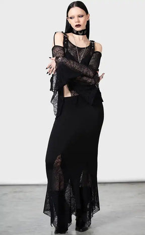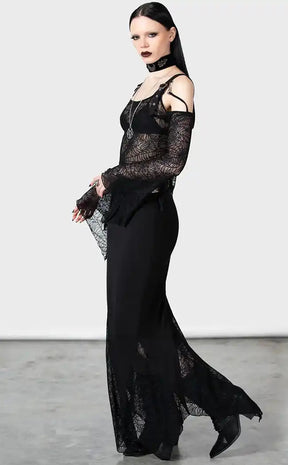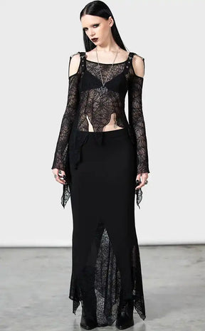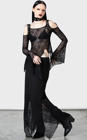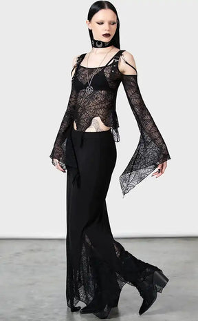 Soft, stretchy black maxiskirt with statement custom spiderweb mesh cutouts. This skirt flows over the legs in an asymmetric hanky style hem and has a comfortable elasticated waistband.