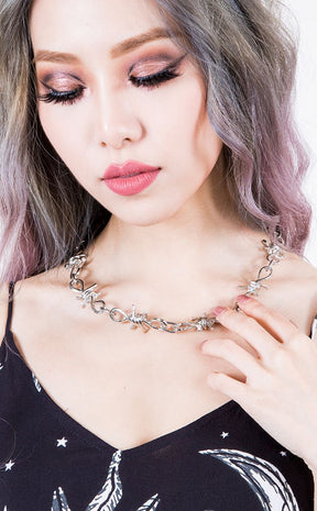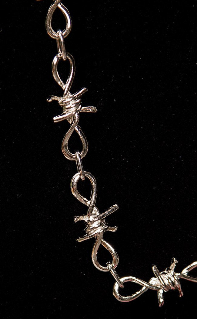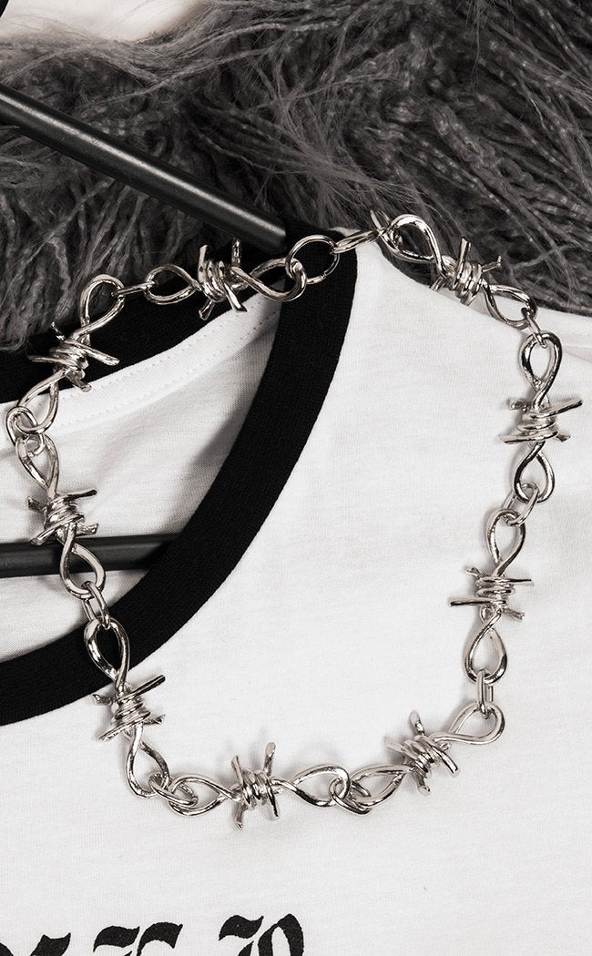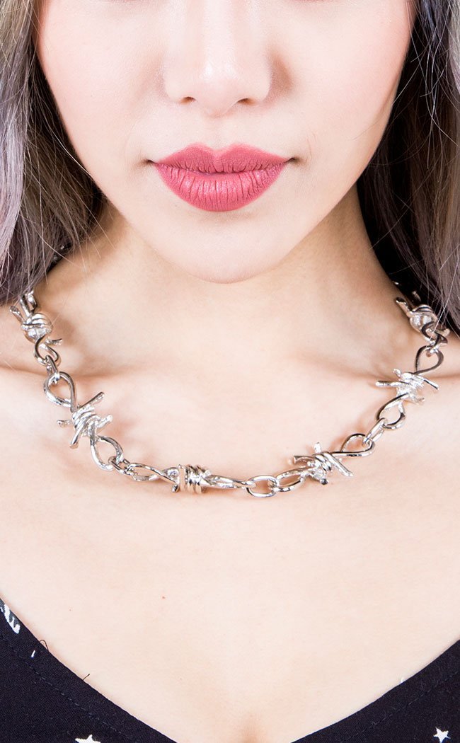 Cute lil silver barbed wire necklace. It sits at the collarbones rather than fitting close to the neck like a choker.