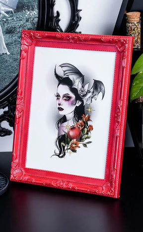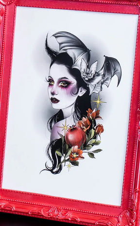 This art print showcases a devilish woman embracing a creature of darkness alongside forbidden treats.