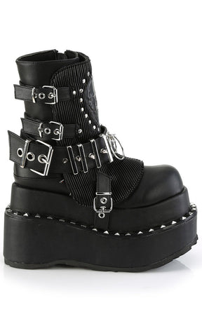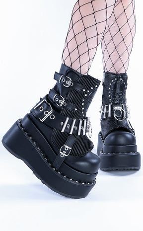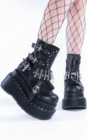 Go all out for the glory of punk! The BEAR-150 platform ankle boots are decked out in all the best heavy metal deets, including pyramid studs, O rings, buckles and an adjustable shield embossed with a skull. Slip in and out in a snap with an inner zip and feel like a badass in a snap.