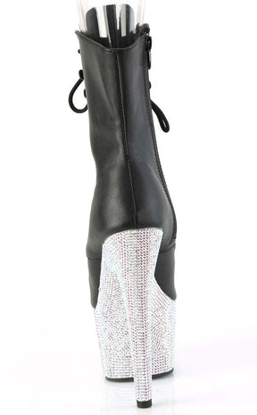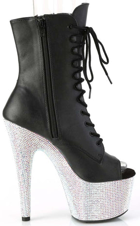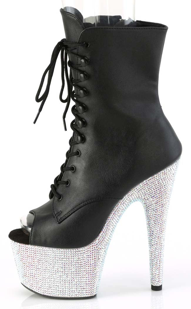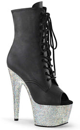Time for a little glitter and shine! The luxurious BEJEWELLED-1021-7 peep-toe boots feature a heel and platform totally encrusted with silver AB rhinestones, topped with black vegan leather. The boots lace up and secure with an inner zip for easy on/off.