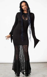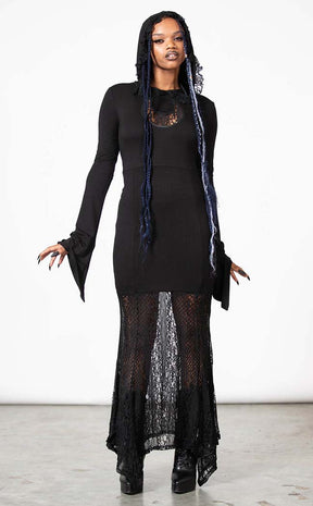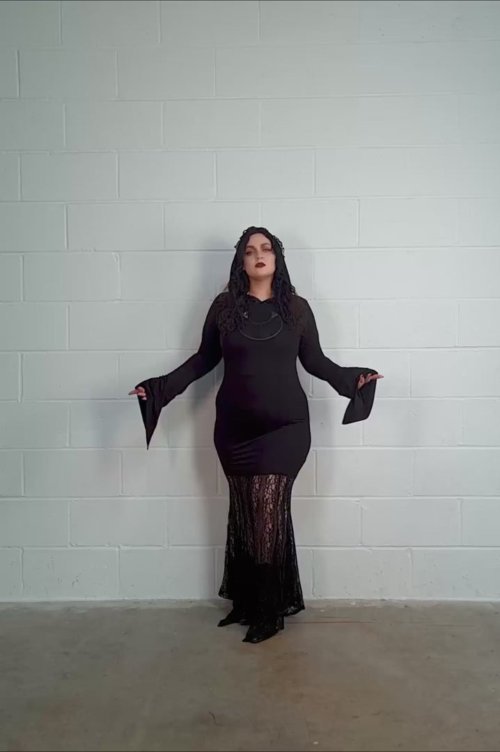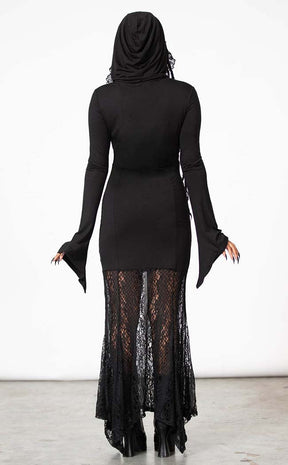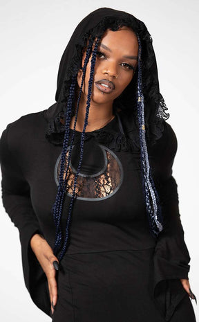 Look gloomy gorgeous in the Besome Hooded Maxi Dress! This unique maxi dress features a statement half n' half design, with an opaque upper finishing in a flowing lace skirt. A cutout lace moon at the chest adds an extra touch of magic, matching the witchy energy of the lacy hood trims and pointed bell sleeves.