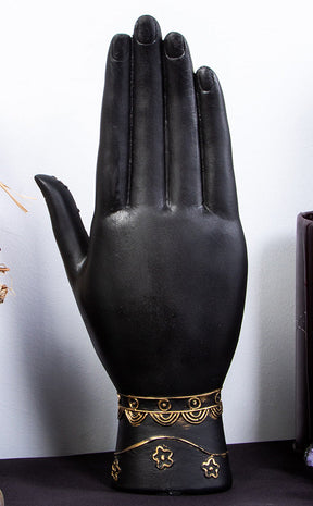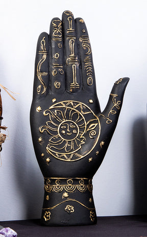 Add an air of mystique and occult vibes to your home with the Black & Gold Palmistry hand! This phrenology-style sculpture features elaborate golden patterning across this outstretched hand, including a sun, crescent moon and stars.