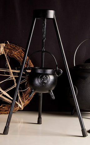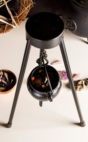 This sturdy black stand is designed to hold your cauldrons perfectly. It is a tripod design that easily collapses to be stored away when not in use. Use to hold your cauldron above a heat source, or just to display it. You can use it to hold any offering bowl or vessel that has a handle.