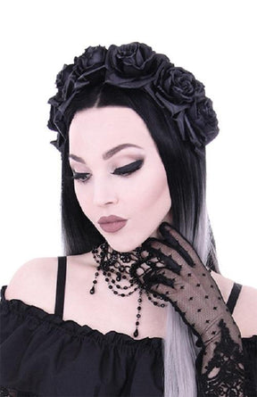 A wide satin headband adorned seven huge black roses. Ideal for formals, proms and weddings.