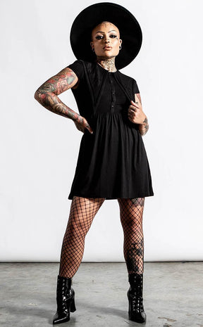 Get summergoth ready in this adorable skater! Soft and stretchy as all the best threads should be, this dress features a button-up front, an oversized collar with wicked embroidery and short cap sleeves.