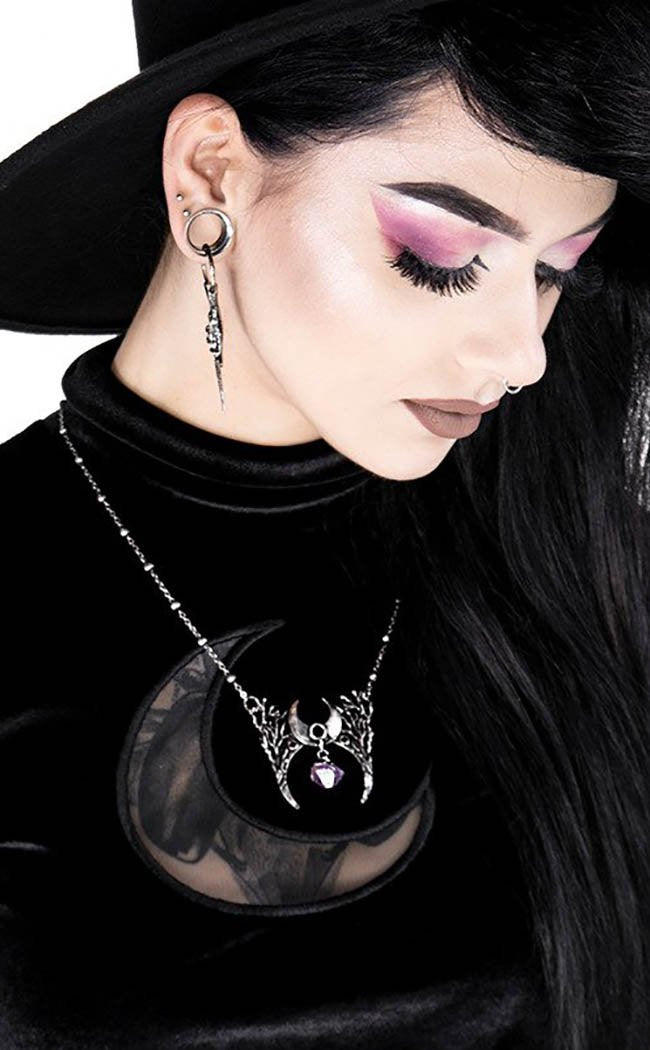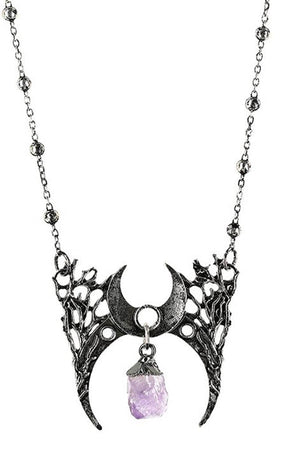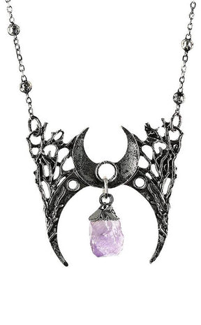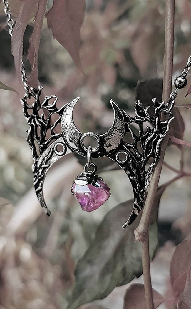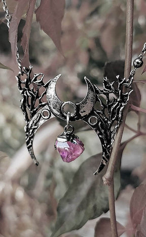 Return to nature with this beautiful pendant. A purple crystal hang in a crescent arch overgrown with gnarled branches.