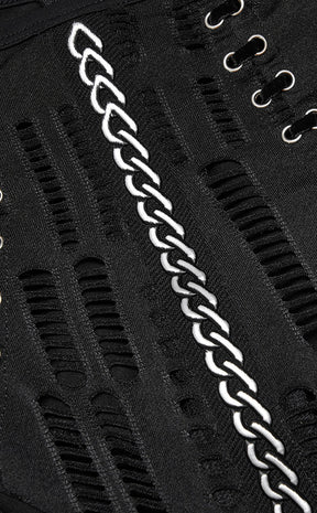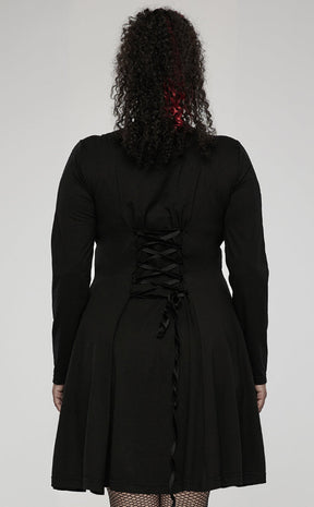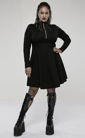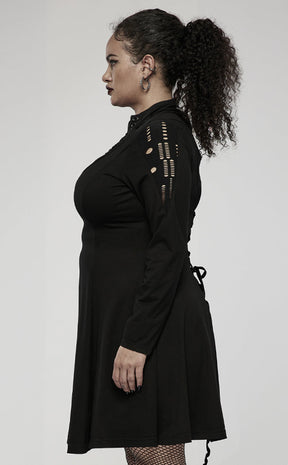 Shuck off the chains of boring fashion in the Break Free Dress! Soft, stretch fabric forms long sleeves, a skater length skirt and a fittest waist that can be cinched further with ribbons at the back. The high neckline features statement embroidery, lacing and shreds that continue down the sleeves to have you looking like something straight outta the Matrix.