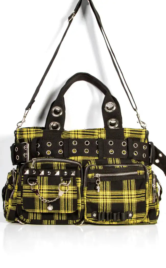 The Camdyn handbag comes in a bold yellow tartan with plenty of heavy metal accessories: spacious zip pockets at the front and sides provide plenty of handy storage as well as extra details like handcuff decals, pen pockets and eyelet straps. The handles and belt are embedded with bold eyelets which leave plenty of room to add your own charms and extra chains.