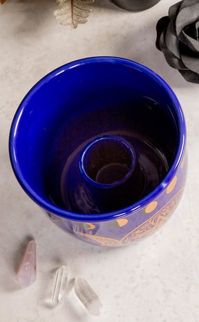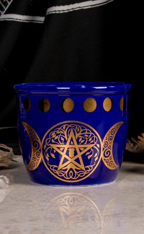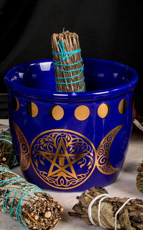 The bowl itself is a beautiful midnight blue with a golden pentagram decal in the shape of the triple goddess symbol, crowned with the phases of the moon sitting just below the rim.