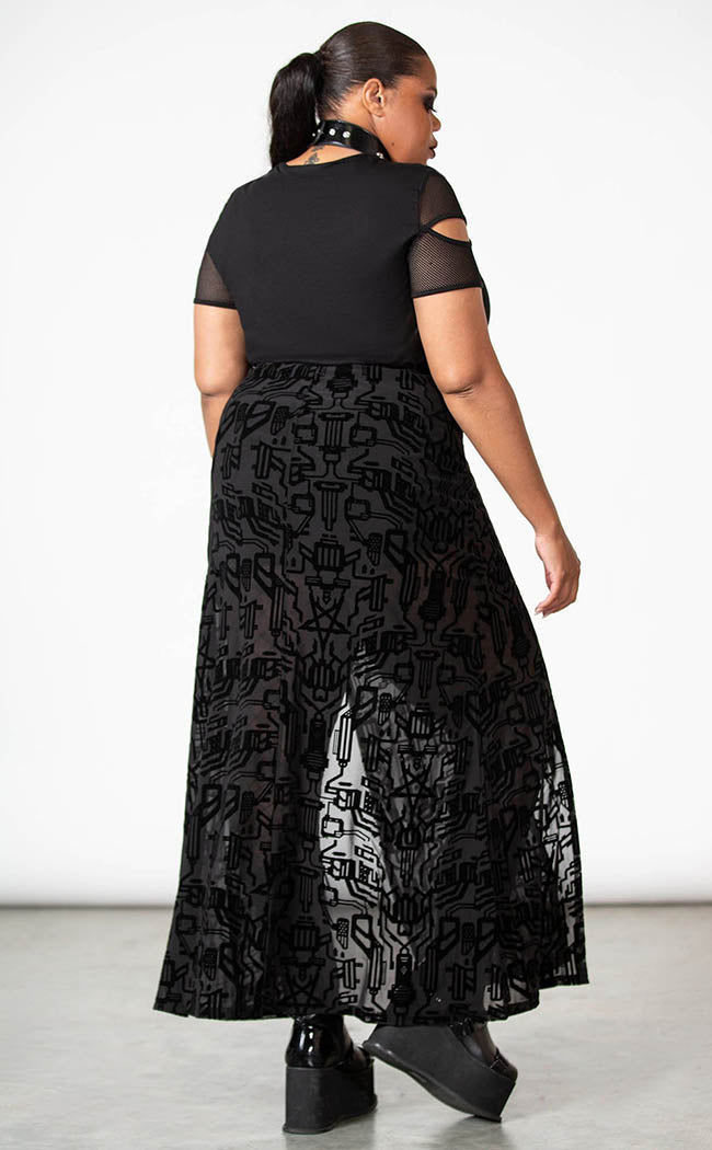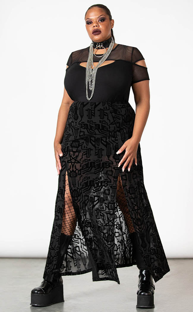 Shock 'em n' rock 'em in the Charged Split Maxi Dress! Sheer, stretch mesh is flocked with mesmerising cyber patterns, forming this high waist maxi with sexy double leg splits. An opaque mini underskirt is built in and the piece secures with a hidden mini sip.