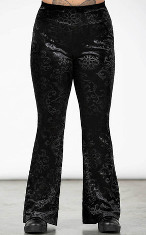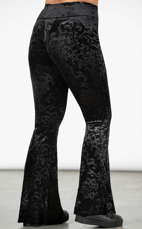 Relax in eternal darkness with the Chill Daze Yoga pants! The best accessory for chilling around your crypt, these pants were made with soft-touch burnout velvet forming into a figure-hugging fit with super flared legs. The wide waistband stretches for a comfortable fit and secures with a drawstring.