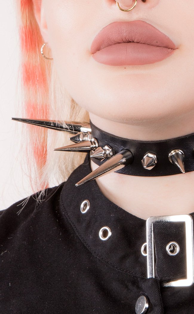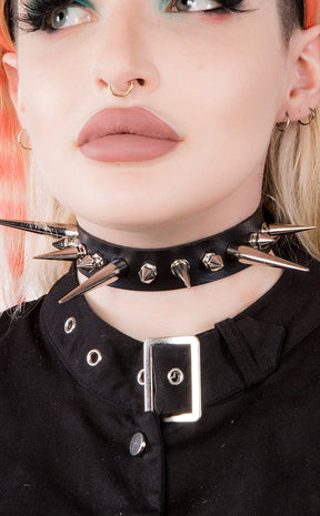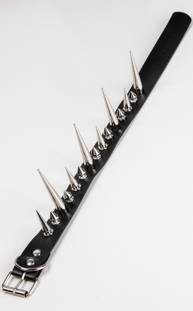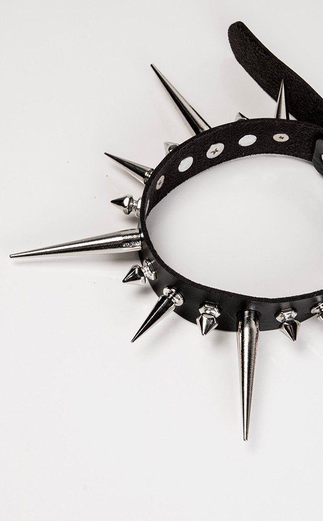 Get yer danger on with this demonic statement piece! Silver spikes of different lengths gash out from a vegan leather band, securing with an adjustable buckle.