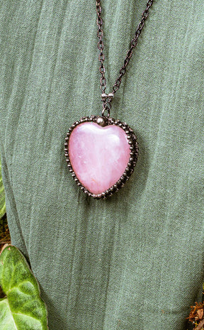 The Clytemnestra's Heart Necklace is made from a beautiful crystal that has been hand shaped into a heart and polished. It is then set in a handmade silver alloy solder double-sided setting. This pendant hangs from a gunmetal plated iron chain which is adjustable between approximately 70-78cm long, with a lobster clasp and a crescent moon charm. These necklaces are hand made and each is beautifully unique.