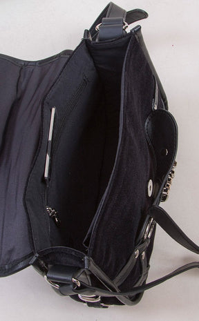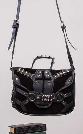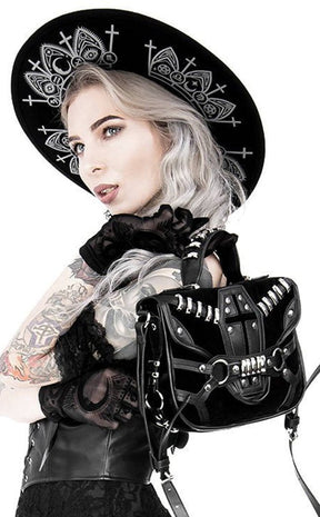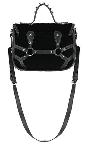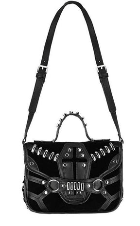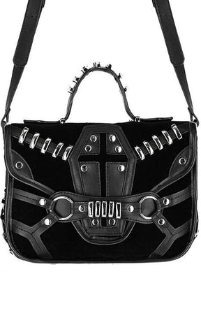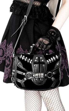 Strappy, studded style straight outta yer local Raveyard. A faux leather crossed coffin sits snugly inside a harness look on the front flap of this purse, which comes with an adjustable strap to keep your unmentionables safe and close along with a studded handle to turn it into a potential weapon (or to just carry by hand).