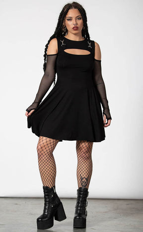 Dress to match yer evil mood in the Corin Long Sleeve Dress! Soft stretch fabric drapes beautifully over your figure, fitting in just the right places. The high neckline features a statement keyhole and metal hardware details, adding an edge alongside the cold shoulders and mesh sleeves complete with thumbholes.