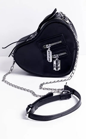 This black vegan leather bag adds a bit of punk to your look with metal razor zip details at the front and a silver chain strap.