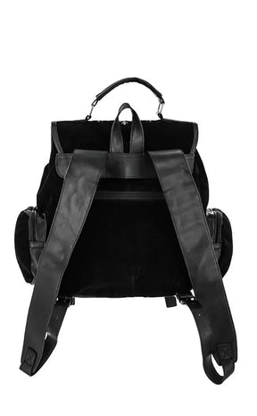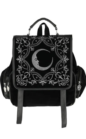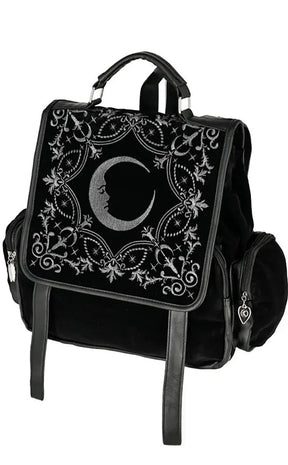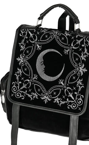 The Restyle Crescent Moon Velvet Embroidered Backpack is a beautiful gothic backpack with a gorgeous intricate embroidered design on the front flap. This gothic bag is equipped with a top handle and adjustable straps, making it easy to adjust for comfortable carrying.