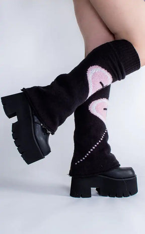 The 2000s are back and we cannot get enough of these emo aesthetic black knit leg warmers! Featuring a kawaii pastel pink heart and cross design with detail wrapping around the back, these leg warmers are a pastel goth dream.