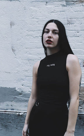 Create a classy silhouette with this gorgeous top: made ethically with premium stretch jersey, the words "cry baby" are embroidered in white beneath the high neck. Wear alone or over contrasting long sleeved tops with slim fit trousers.