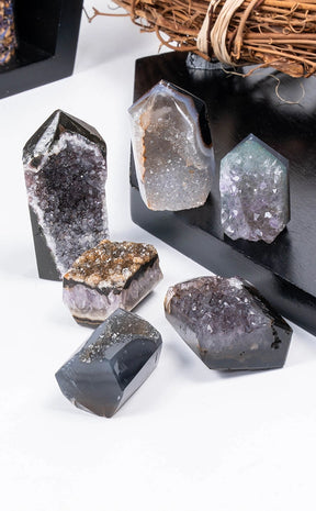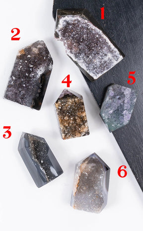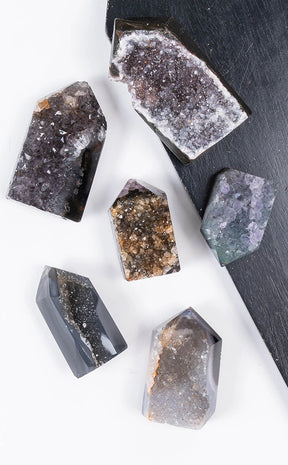 These towers feature striking druzy inclusions all over, adorned with stunning druzy crystals. These are beautiful pieces, although very different from each other!